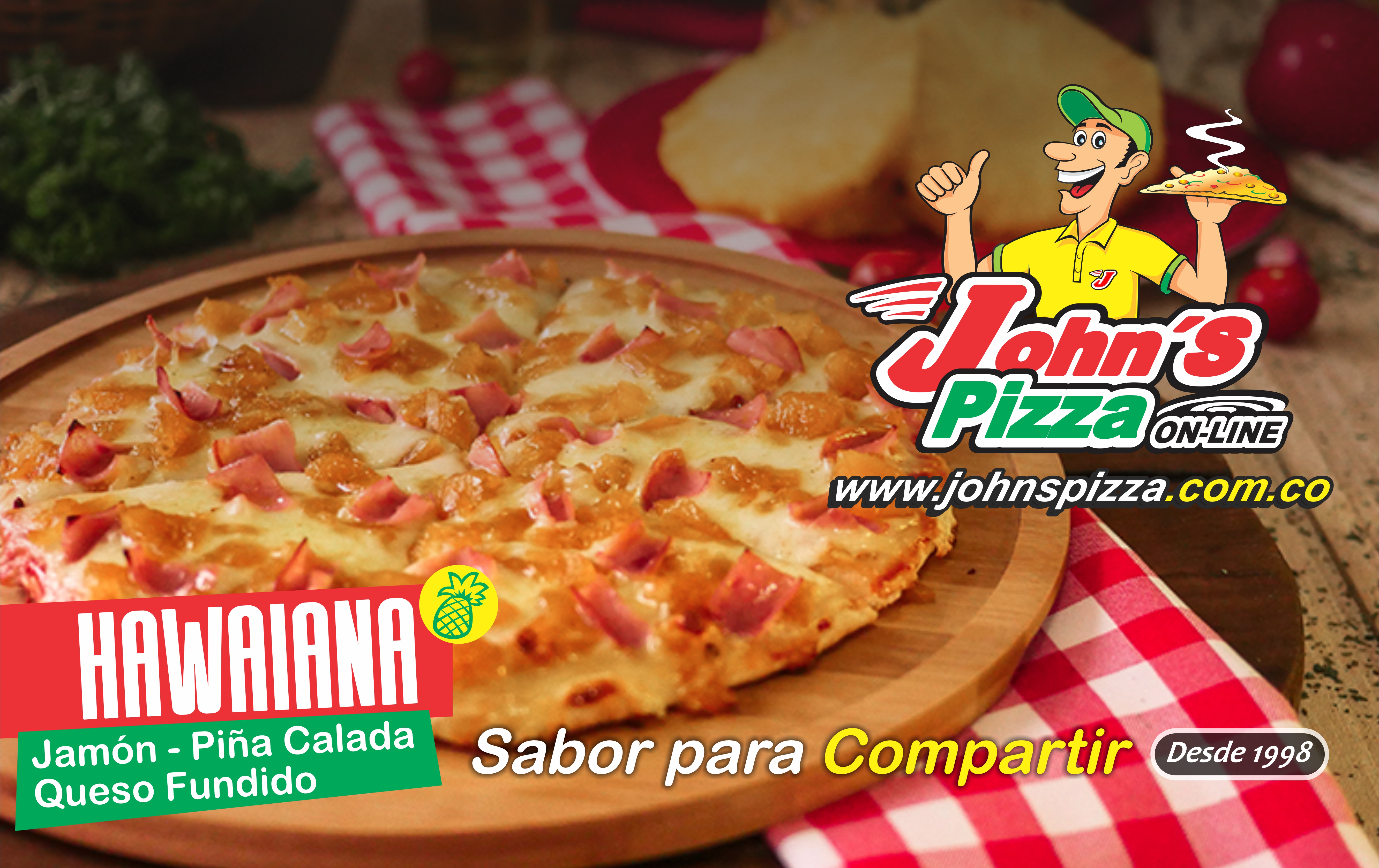 Masa delgada artesanal, Deliciosa Piña Calada, Jamón Ahumado y Queso Fundido.